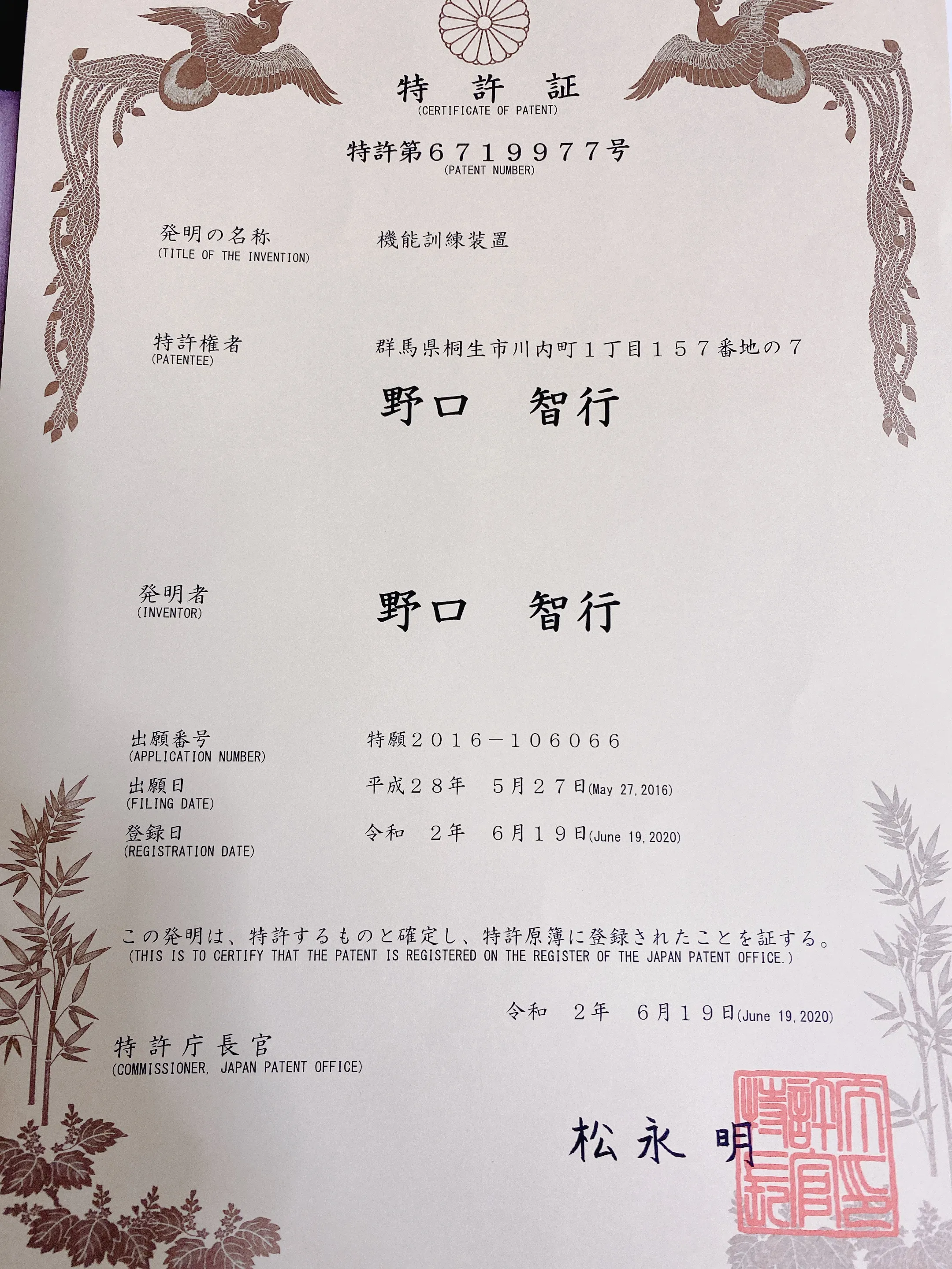 本ページは、当社の「機能訓練装置」に関する特許の基本情報(特許番号・出願番号・日付等)と、 特許証(写し)を掲載するものです。導入・共同研究・ライセンス等のご相談や、 類似品に関する情報提供は、ページ下部の窓口からご連絡ください。